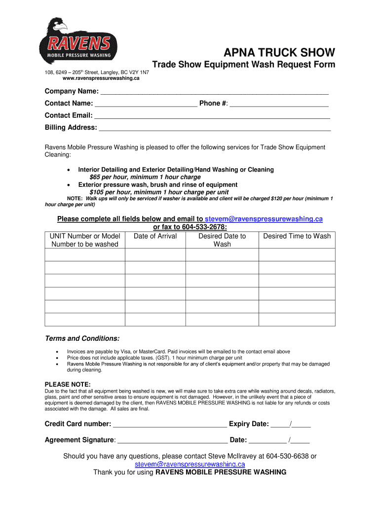 ANNA TRUCK SHOW Trade Show Equipment Wash Request Form 108, 6249 205th Street, Langley, BC V2Y 1N7 www.ravenspressurewashing.caCompany Name: Contact Name: Phone #: Contact Email: Billing Address: