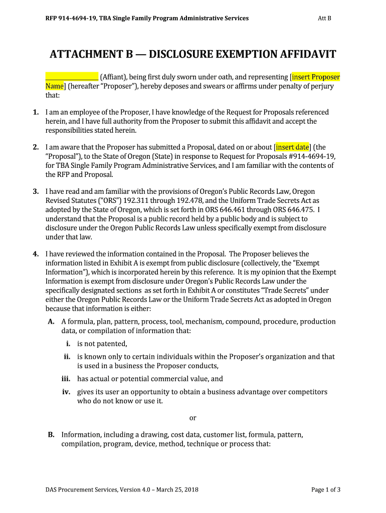 RFP 914469419, TBA Single Family Program Administrative Services ATTACHMENT B DISCLOSURE EXEMPTION AFFIDAVIT (Affine), being first duly sworn under oath, and representing insert Proposer Name (hereafter