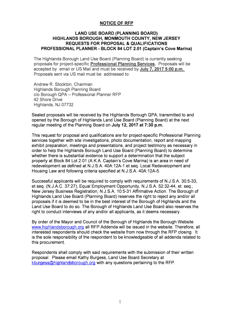 Get the free notice of rfp land use board (planning board) highlands ...