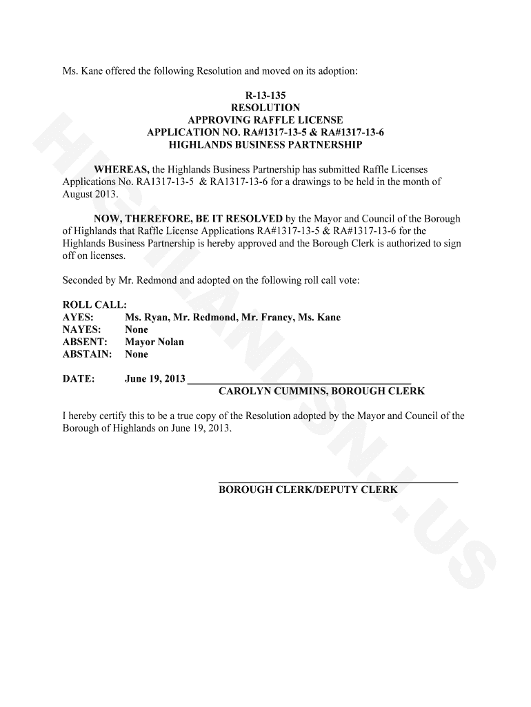 Ms. Kane offered the following Resolution and moved on its adoption:HR13135 RESOLUTION APPROVING RAFFLE LICENSE APPLICATION NO. RA#1317135 & RA#1317136 HIGHLANDS BUSINESS PARTNERSHIPIGWHEREAS, the