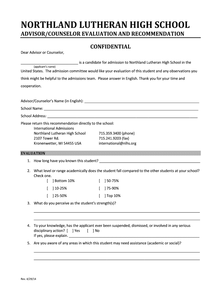 NORTHLAND LUTHERAN HIGH SCHOOL ADVISOR/COUNSELOR EVALUATION AND RECOMMENDATION CONFIDENTIAL Dear Advisor or Counselor, is a candidate for admission to Northland Lutheran High School in the (applicants