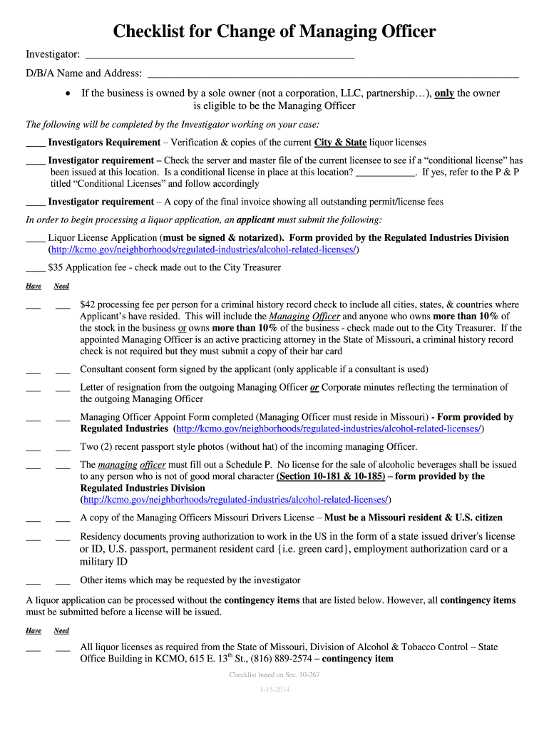 Checklist for Change of Managing Officer Investigator: D/B/A Name and Address: If the business is owned by a sole owner (not a corporation, LLC, partnership), only the owner is eligible to be the