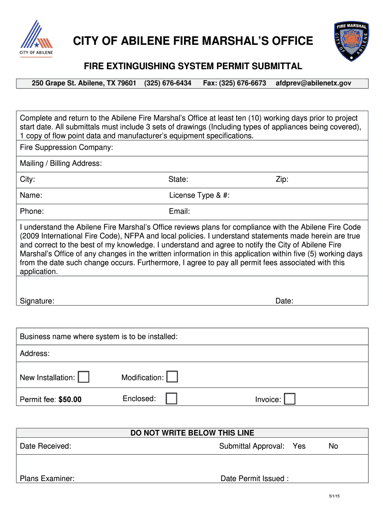 CITY OF ABILENE FIRE MARSHALS OFFICE250 Grape St. Abilene, TX 79601(325) 6766434Fax: (325) 6766673afdprev Abilene. Noncommercial COOKING (UL 300) AUTOMATIC FIRE EXTINGUISHING SYSTEM SUBMITTAL GUIDELINE