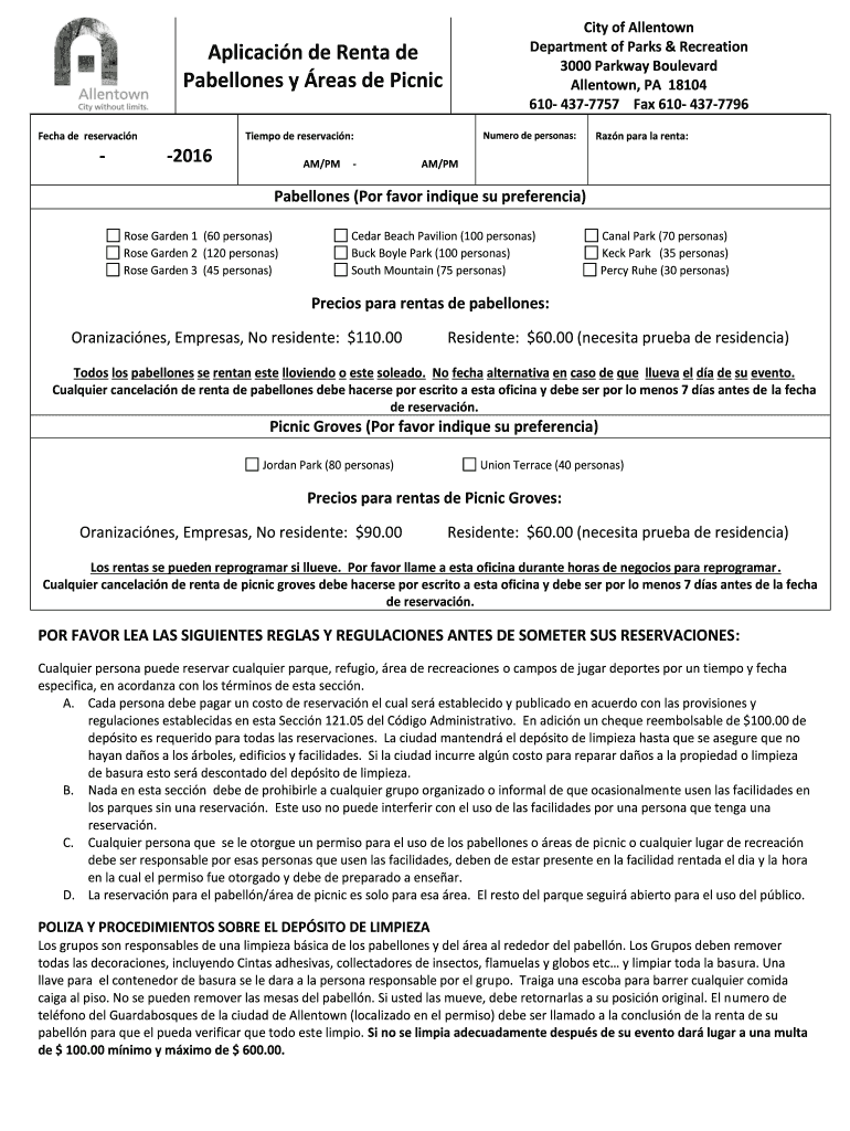City of Allentown Department of Parks & Recreation 3000 Parkway Boulevard Allentown, PA 18104 610 4377757 Fax 610 4377796Aplicacin de Rent de Pabellones y areas DE Picnic Tech de reservacinNumero
