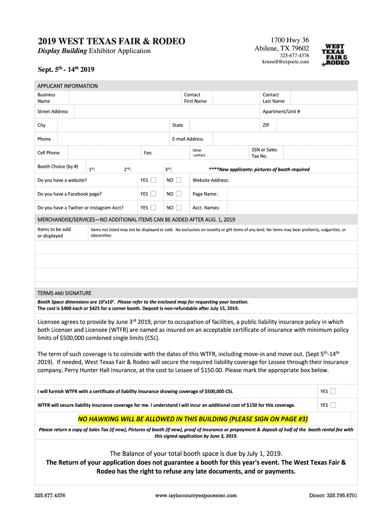1700 Hwy 36 Abilene, TX 796022019 WEST TEXAS FAIR & RODEO Display Building Exhibitor Application3256774376 Russell export.com Sept. 5th 14th 2019 APPLICANT INFORMATION Business Recontact First Recontact