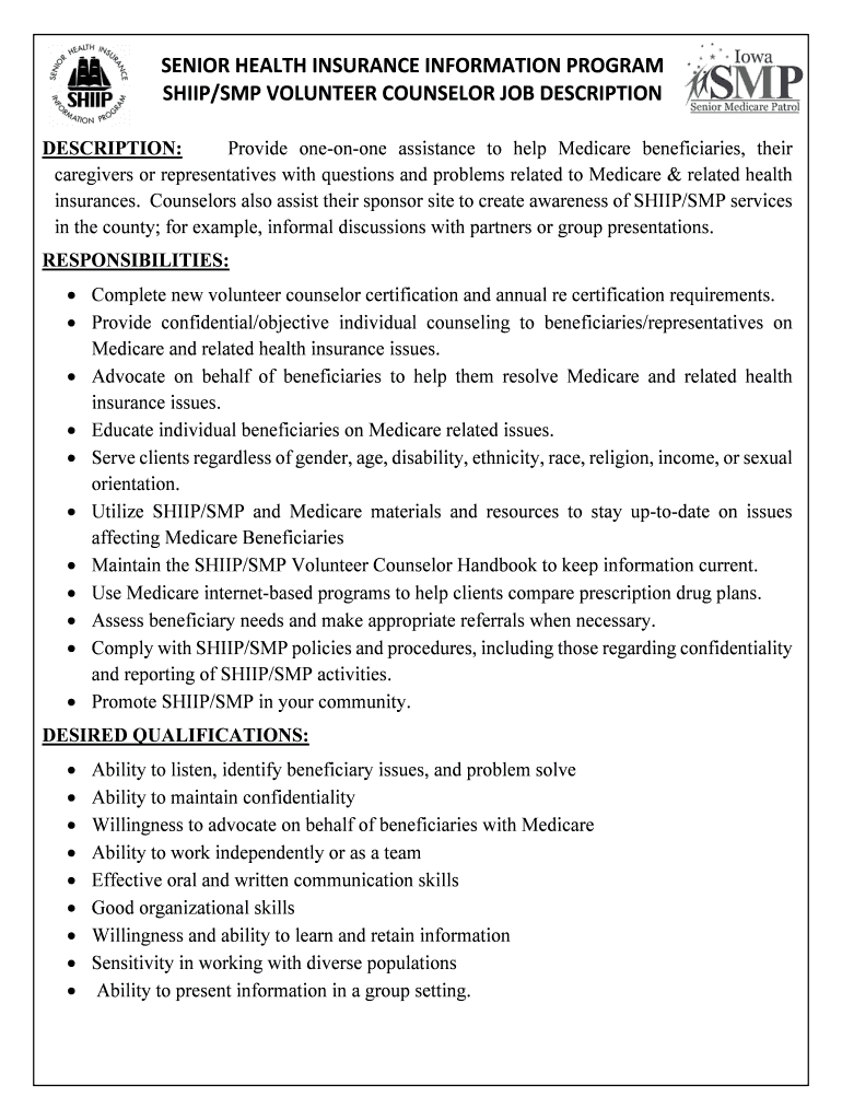 SENIORHEALTHINSURANCEINFORMATIONPROGRAM SHIP/SMPVOLUNTEERCOUNSELORJOBDESCRIPTION DESCRIPTION: Provide OneNote assistance to help Medicare beneficiaries, their caregivers or representatives with questions