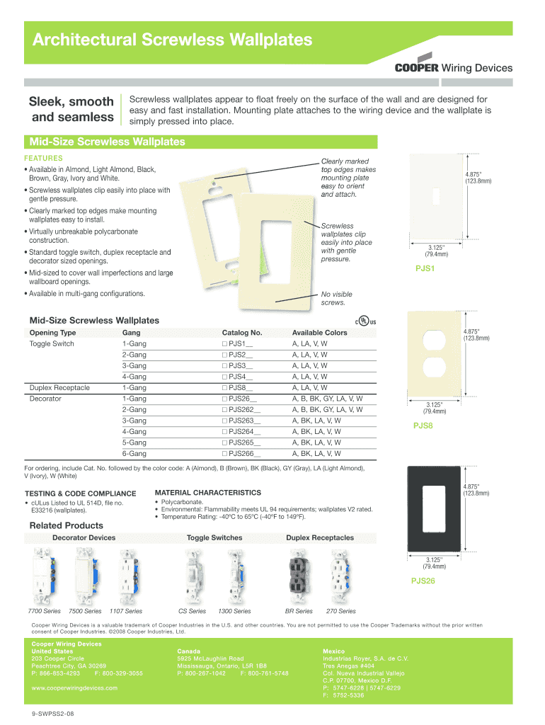 Information such as the type of wallplate, color, number of gangs, and any additional features must be reported on architectural screwless wallplates.