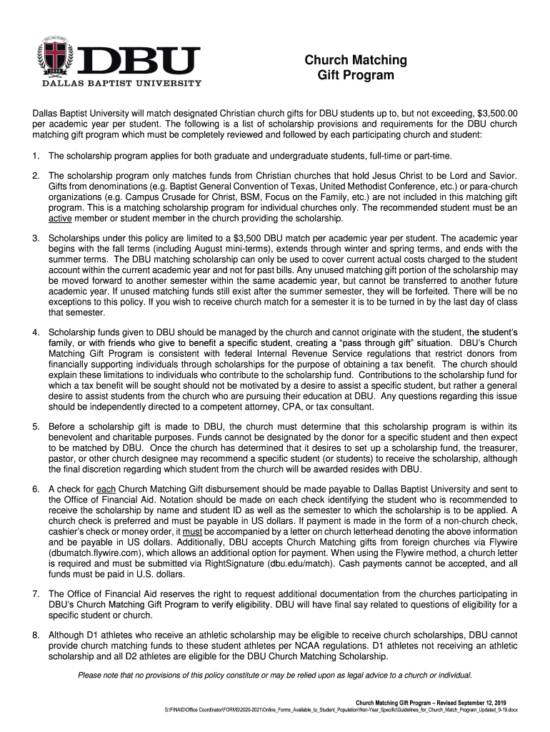 Dallas Baptist University will match designated Christian church gifts for DBU students up to, but not exceeding, $3,500.00