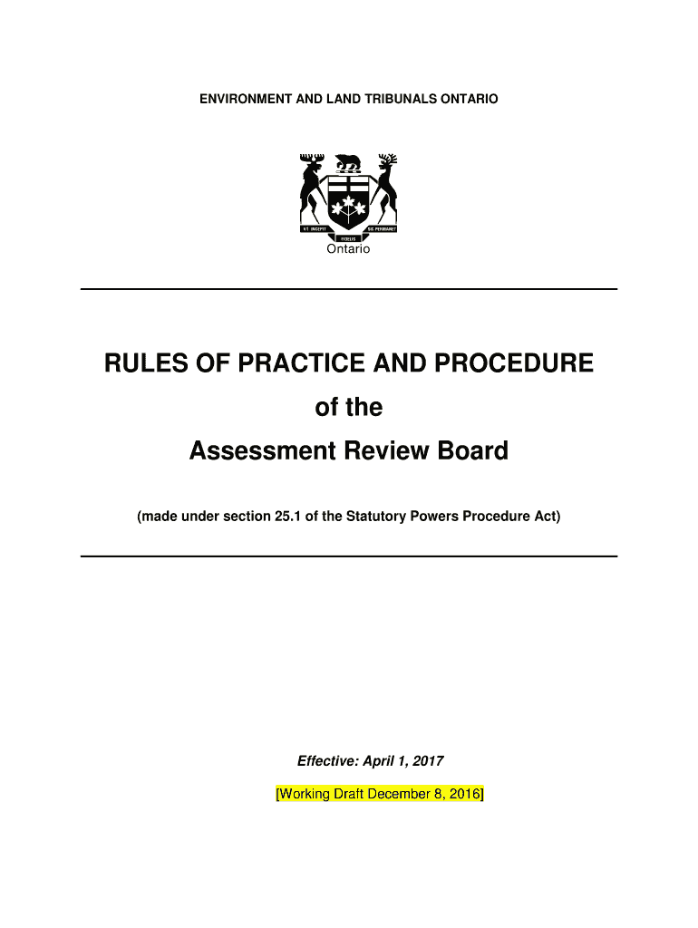ENVIRONMENT AND LAND TRIBUNALS ONTARIORULES OF PRACTICE AND PROCEDURE of the Assessment Review Board (made under section 25.1 of the Statutory Powers Procedure Act)Effective: April 1, 2017, Working