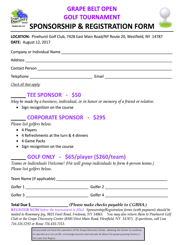 GRAPE BELT OPEN GOLF TOURNAMENTWestfield, New YorkSPONSORSHIP & REGISTRATION FORMATION: Pankhurst Golf Club, 7428 East Main Road/NY Route 20, Westfield, NY 14787 DATE: August 12, 2017, Company or