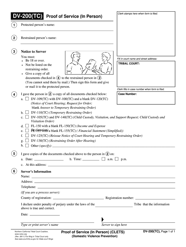 The Proof of Service In Person Form (DV-200(TC)) is a legal document used by servers to record the delivery of court documents concerning domestic violence restraining orders in California's Tribal Courts.