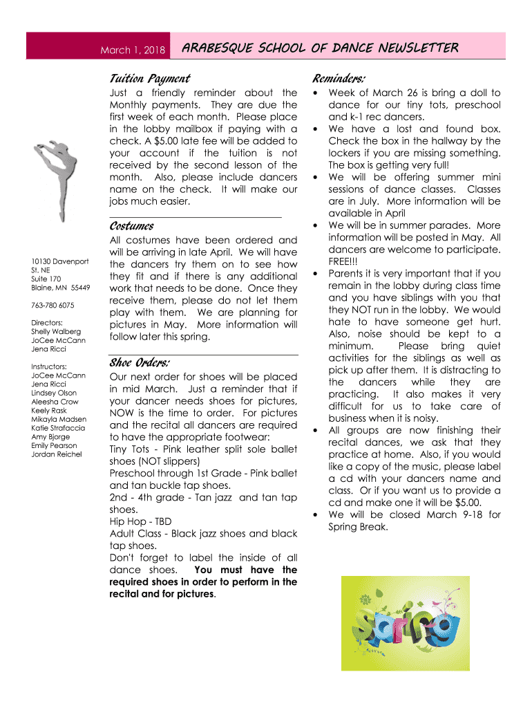March 1, 2018ARABESQUE SCHOOL OF DANCE NEWSLETTERTuition PaymentReminders:Just a friendly reminder about the Monthly payments. They are due the first week of each month. Please place in the lobby
