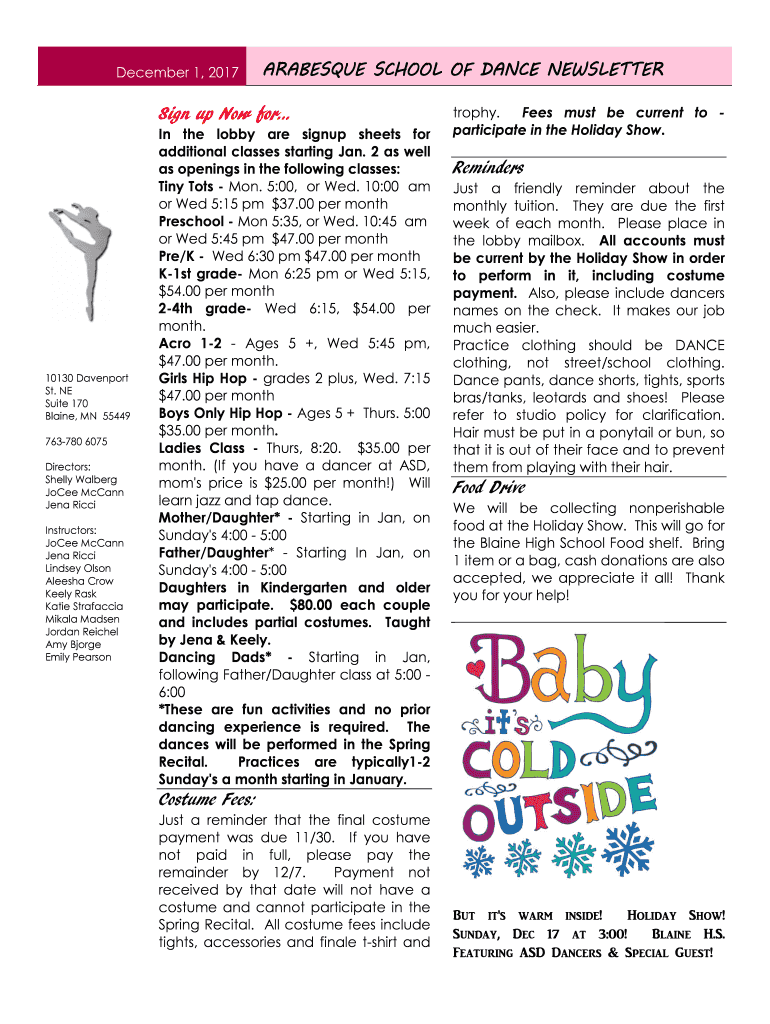 December 1, 2017ARABESQUE SCHOOL OF DANCE Newsletters up Now for...10130 Davenport St. NE Suite 170 Blaine, MN 55449 763780 6075 Directors: Shelly Weinberg Joe McCann Jena Rich Instructors: Joe McCann