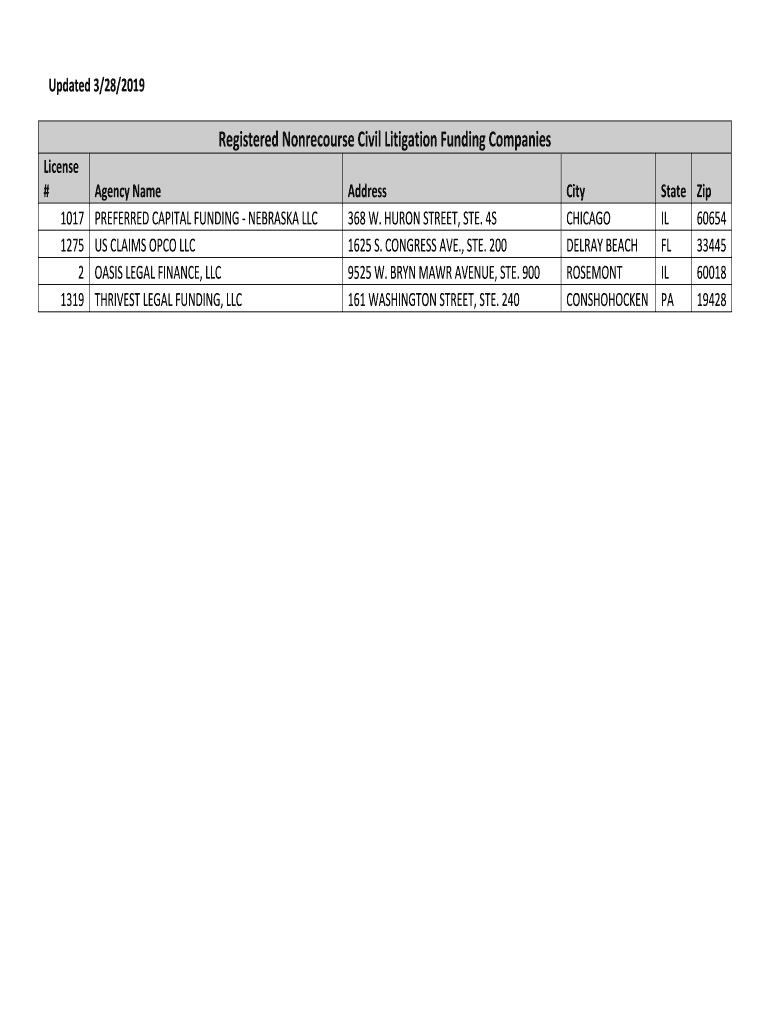 Updated 3/28/2019Registered Nonrecourse Civil Litigation Funding Companies License # 1017 1275 2 1319Agency Name PREFERRED CAPITAL FUNDING NEBRASKA LLC US CLAIMS OCO LLC OASIS LEGAL FINANCE, LLC THRIVES