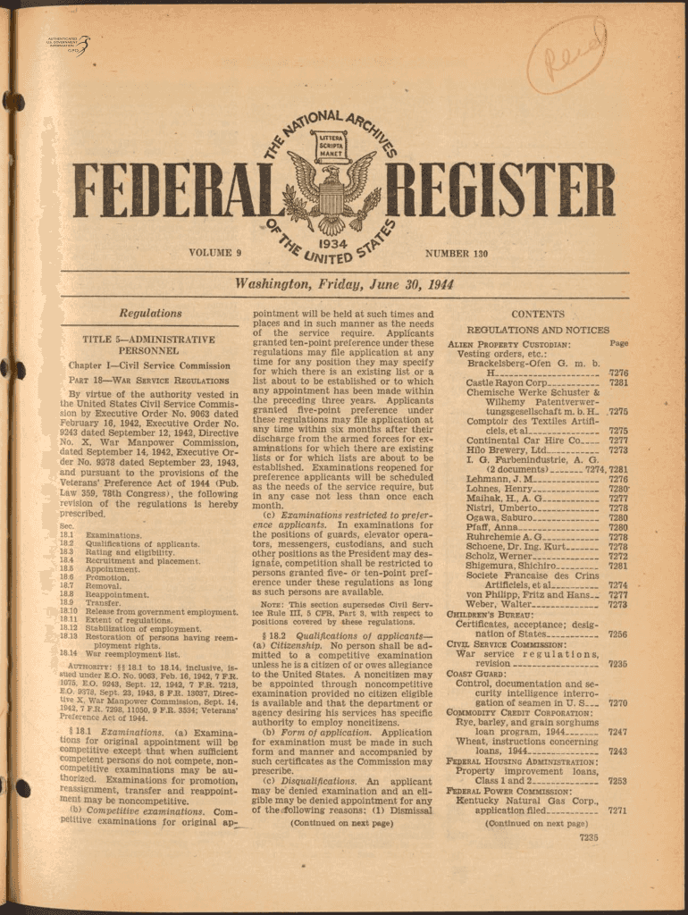 O n an l C/i green register VOLUME 91934 × A f/T E O NUMBER 130Washington, Friday, June 30, 1944, Regulationspointment will be held at such times and CONTENTS places and in such manner as the needs
