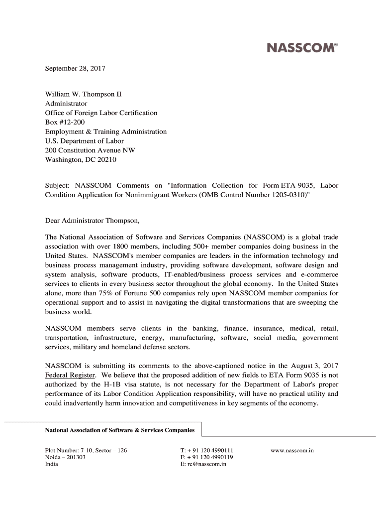 September 28, 2017William W. Thompson II Administrator Office of Foreign Labor Certification Box #12200 Employment & Training Administration U.S. Department of Labor 200 Constitution Avenue NW Washington,