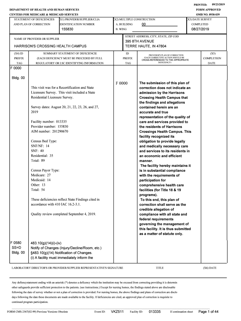 09/23/2019PRINTED: DEPARTMENT OF HEALTH AND HUMAN SERVICESFORM APPROVEDCENTERS FOR MEDICARE & MEDICAID SERVICES STATEMENT OF DEFICIENCIES(X1) PROVIDER/SUPPLIER/LIGAND PLAN OF CORRECTIONIDENTIFICATION