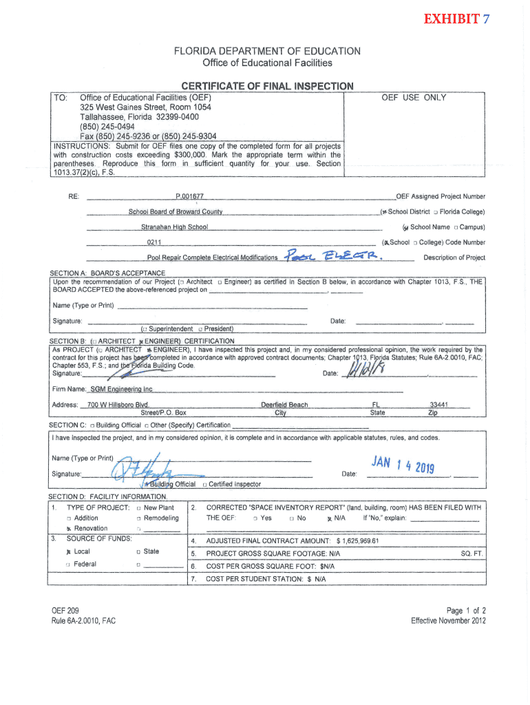 EXHIBIT 7 FLORIDA DEPARTMENT OF EDUCATION Office of Educational Facilities CERTIFICATE OF FINAL INSPECTION Office of Educational Facilities (OF) 325 West Gaines Street, Room 1054 Tallahassee, Florida