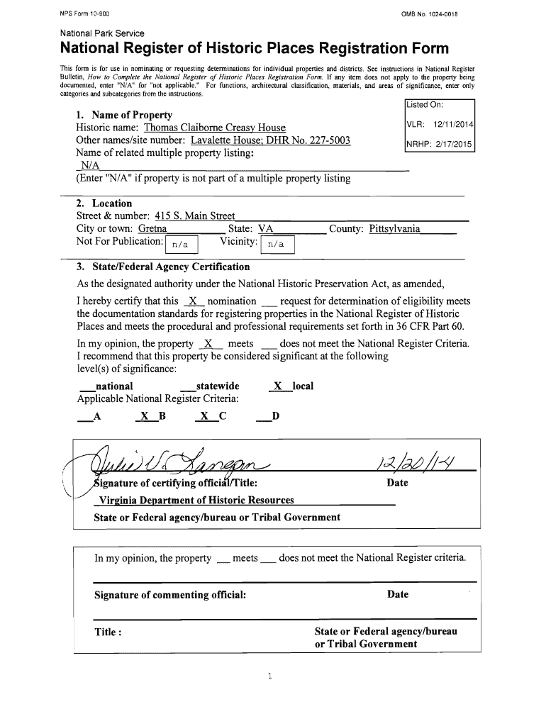 NPS Form 19900OMB No. 10240018National Park ServiceNational Register of Historic Places Registration Form This form is for use in nominating or requesting determinations for individual properties