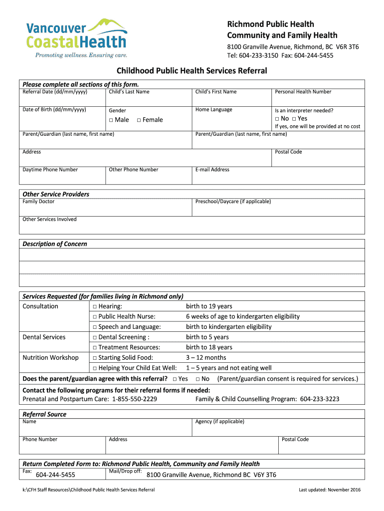 Richmond Public Health Community and Family Health 8100 Granville Avenue, Richmond, BC V6R 3T6 Tel: 6042333150 Fax: 6042445455Childhood Public Health Services Referral Please complete all sections