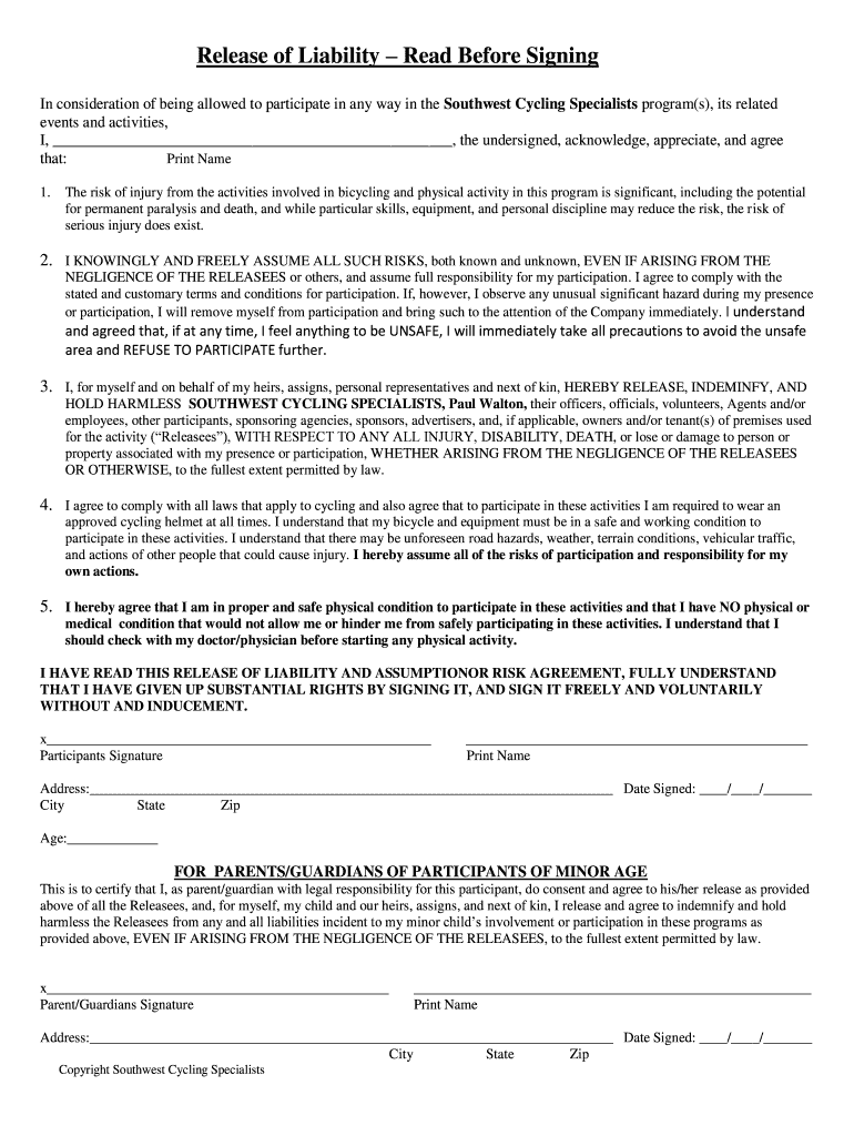 Release of Liability Read Before Signing In consideration of being allowed to participate in any way in the Southwest Cycling Specialists program(s), its related events and activities, I, the undersigned,