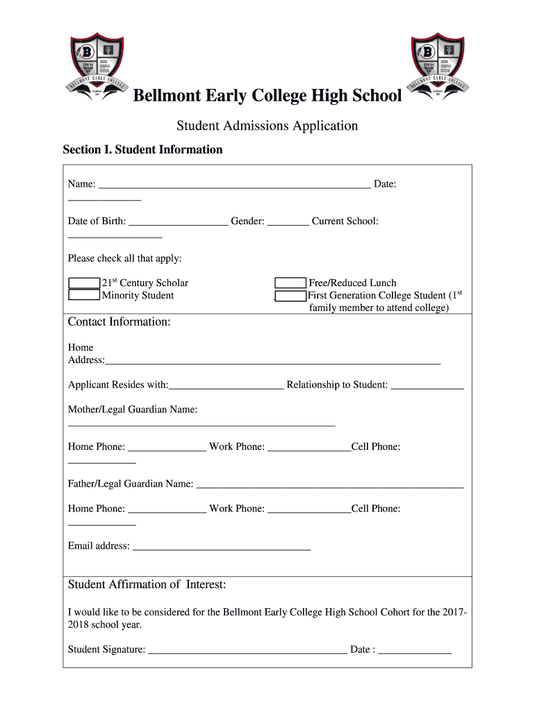 Belmont Early College High School Student Admissions Process 20192020 Students wishing to enroll in the Belmont Early College High School Cohort Program must submit a completed application to Belmont