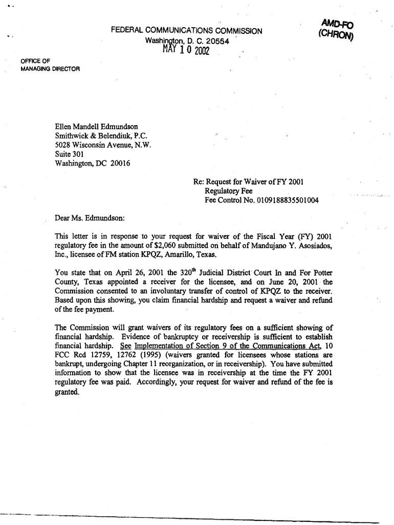 . .FEDERAL COMMUNICATIONS COMMISSION, washing. 2O0554AMDFo (CHARON).OFFICE OF MANAGING DIRECTOR Ellen Mandell Edmundson Smith wick & Blending, P.C. 5028 Wisconsin Avenue, N.W. Suite 301 Washington,
