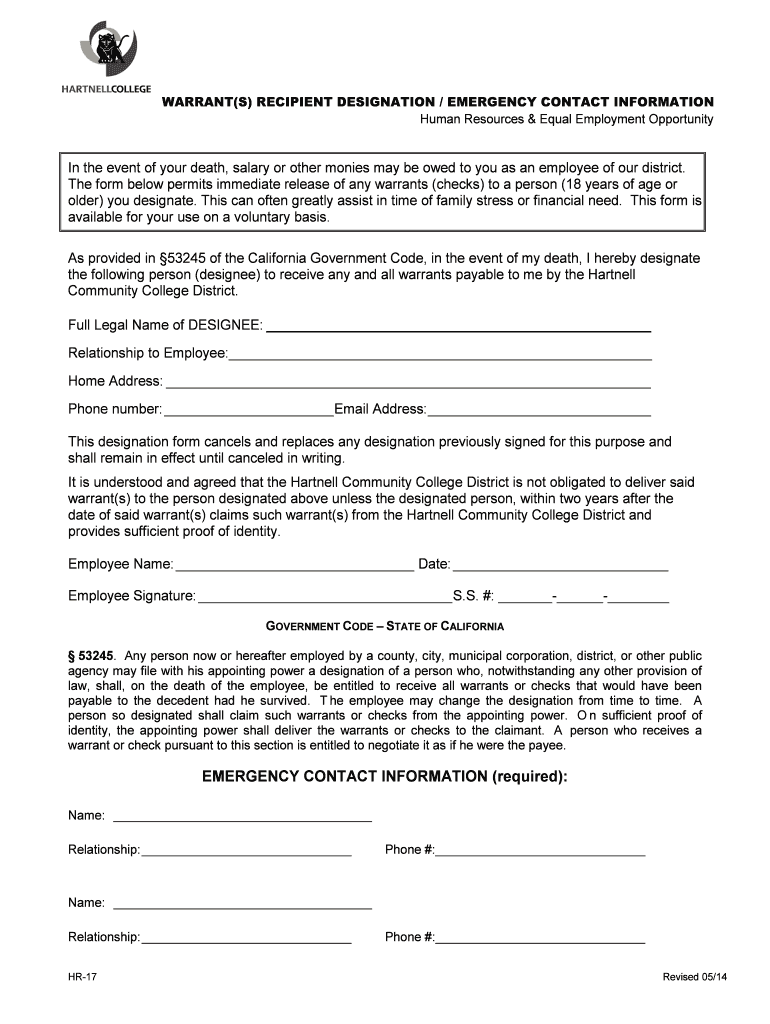 INSTRUCTIONS FOR COMPLETING PROFESSIONAL EXPERT PAPERWORK Human Resources & Equal Employment OpportunityWelcome to Hartnell College! This packet includes the forms necessary to process you as a new