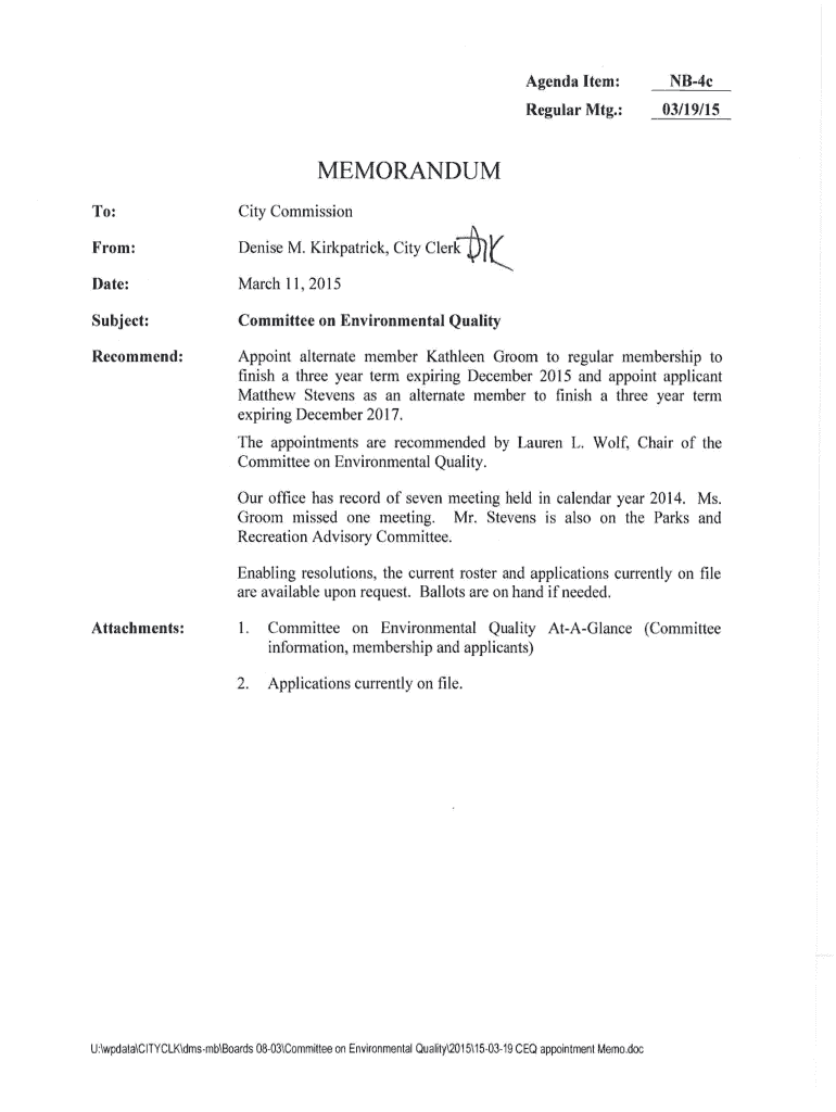 To:City Commissioner:Denise M. Kirkpatrick, City ClerkbJDate:March 11,2015Subject:Committee on Environmental QualityRecommend:Appoint alternate member