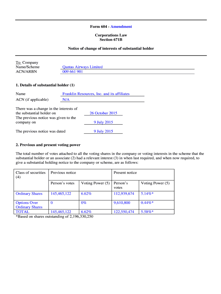 Form 604 Amendment Corporations Law Section 671B Notice of change of interests of substantial holder Company Name/Scheme ACN/ARBNQantas Airways Limited 009 661 9011. Details of substantial holder
