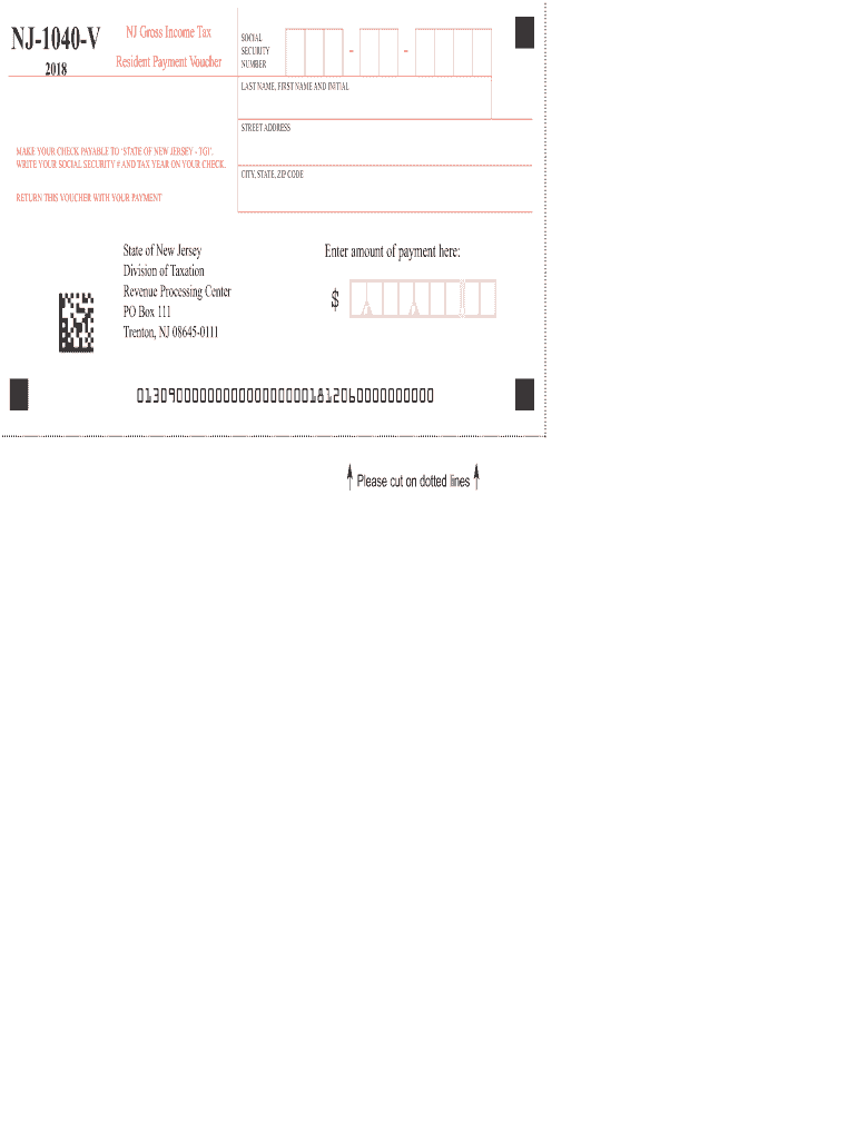 NJ1040V 2018NJ Gross Income Tax Resident Payment VoucherSOCIAL SECURITY NUMBERLESS NAME, FIRST NAME AND INITIALSTREET ADDRESS MAKE YOUR CHECK PAYABLE TO STATE OF NEW JERSEY TGI. WRITE YOUR SOCIAL