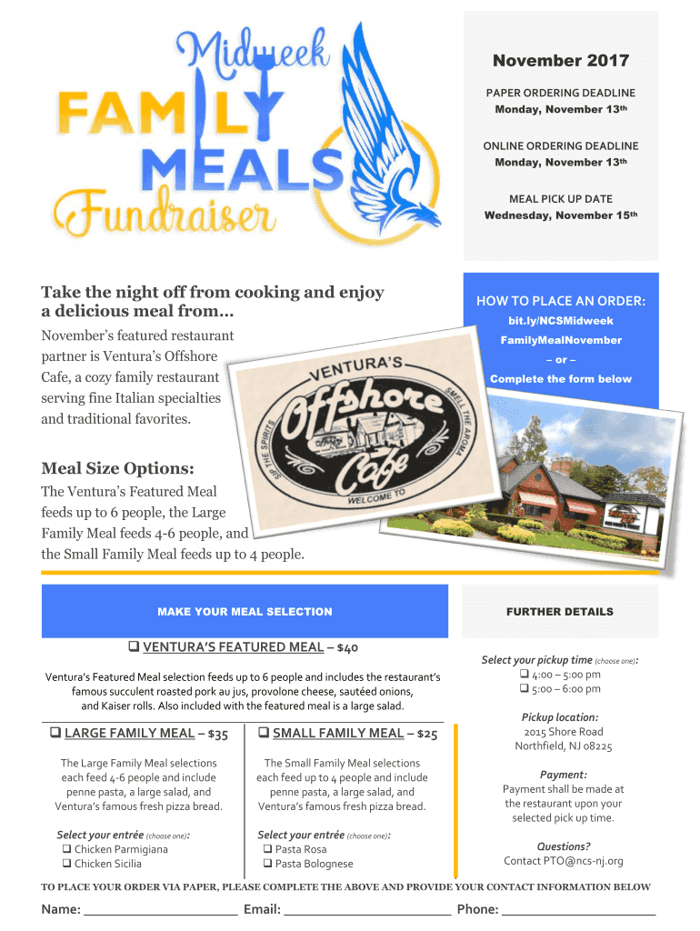 November 2017 PAPER ORDERING DEADLINE Monday, November 13thONLINE ORDERING DEADLINE Monday, November 13thMEAL PICK UP DATE Wednesday, November 15thTake the night off from cooking and enjoy a delicious