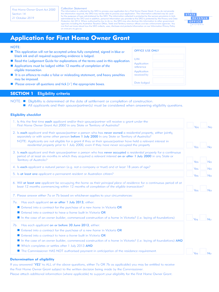 21 October 2019Collection Statement information is collected by the SRO to process your application for a First homeowner Grant. If you do not provide