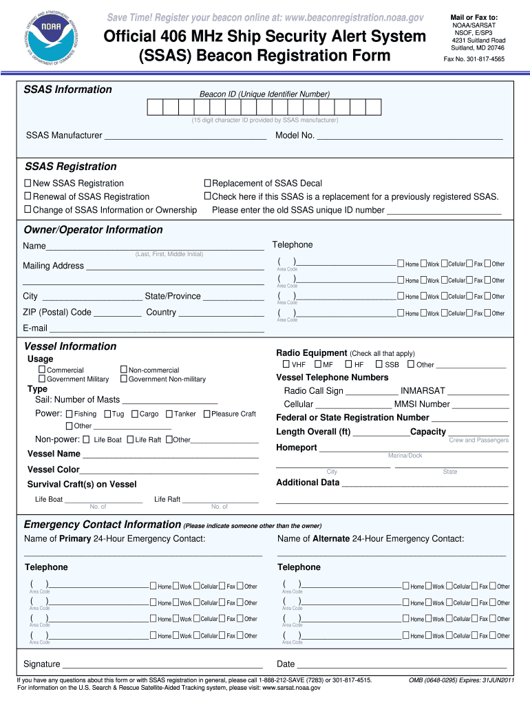 Save Time! Register your beacon online at: www.beaconregistration.noaa.govMail or Fax to:Official 406 MHz Ship Security Alert System (SSAS) Beacon Registration Format No. 3018174565SSAS Information