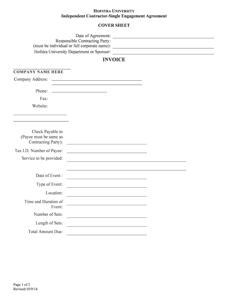 HOST UNIVERSITY Independent ContractorSingle Engagement Agreement COVER SHEET Date of Agreement: Responsible Contracting Party: (must be individual or full corporate name): Host University Department