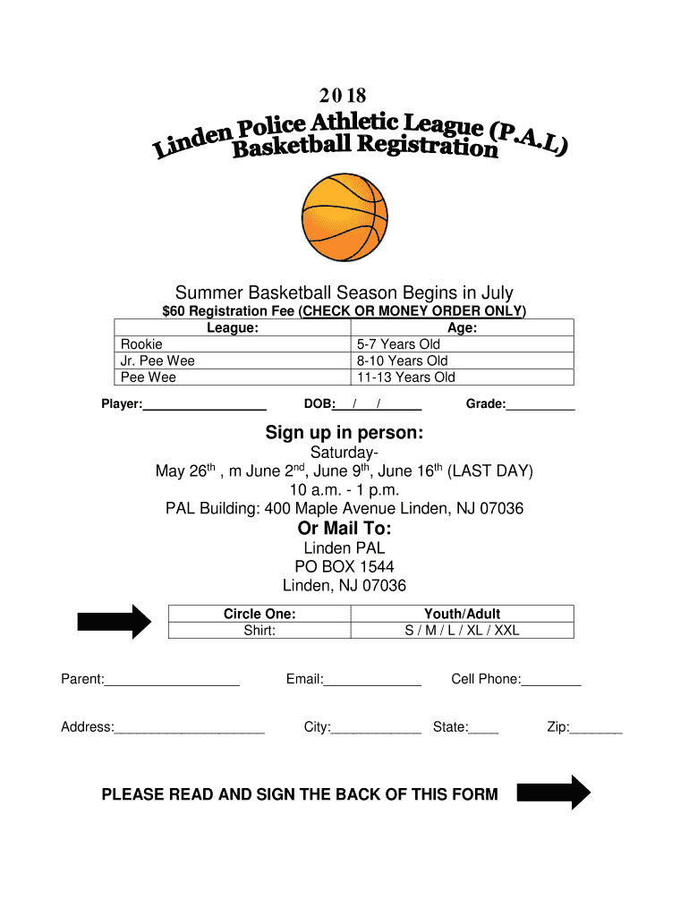 2018Summer Basketball Season Begins in July $60 Registration Fee (CHECK OR MONEY ORDER ONLY) League: Age: Rookie 57 Years Old Jr. Pee Wee 810 Years Old Pee Wee 1113 Years Old Player:DOB:// Grade:
