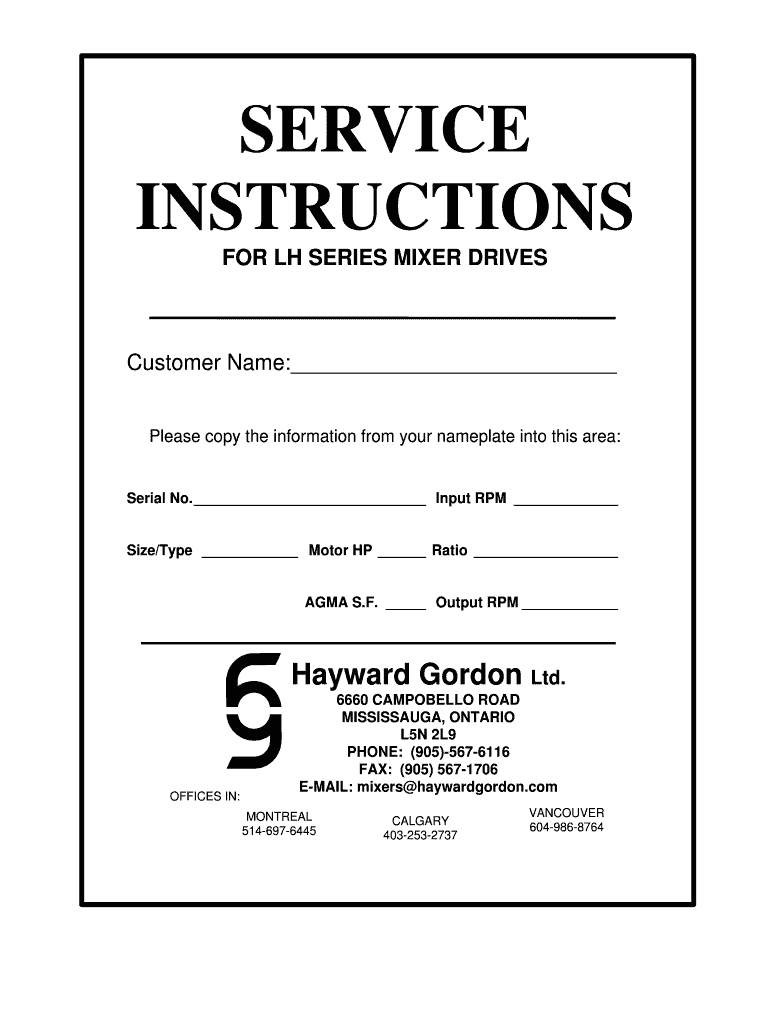 SERVICE INSTRUCTIONS FOR LH SERIES MIXER DRIVESCustomer Name: Please copy the information from your nameplate into this area:Serial No. Input RPM Size/Type Motor HP Ratio ALMA S.F. Output RPM Hayward