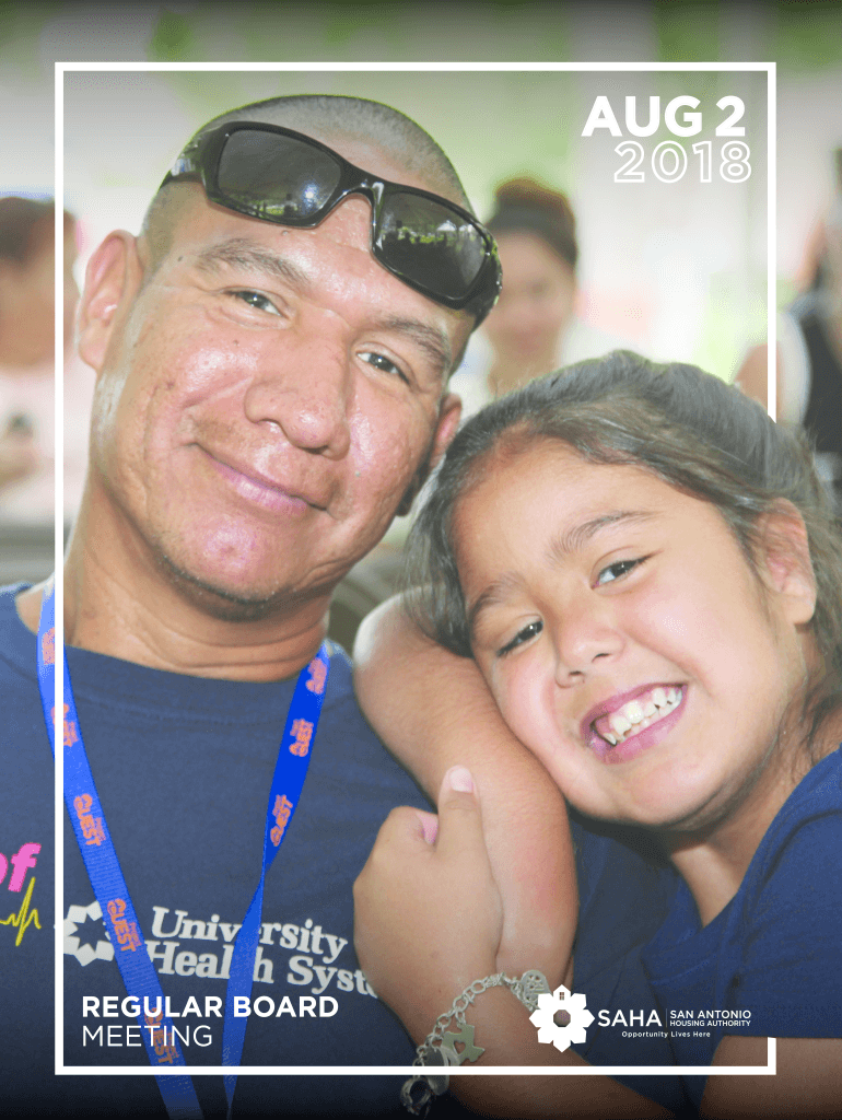 AUG 2REGULAR BOARD MEETING San Antonio Housing Authority *Regular Board Meeting 818 S. Flores St., San Antonio, TX, 78204 1:00 p.m., Thursday, August 2, 20181. Meeting called to order The Board of
