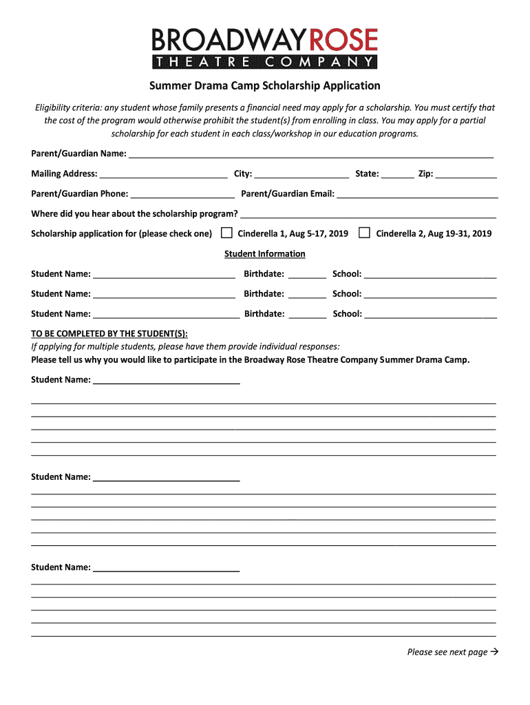 Summer Drama Camp Scholarship Application Eligibility criteria: any student whose family presents a financial need may apply for a scholarship. You must certify that the cost of the program would