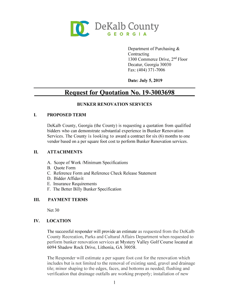 Department of Purchasing & Contracting 1300 Commerce Drive, 2nd Floor Decatur, Georgia 30030 Fax: (404) 3717006 Date: July 5, 2019, Request for Quotation No. 193003698 BUNKER RENOVATION SERVICES I.PROPOSED