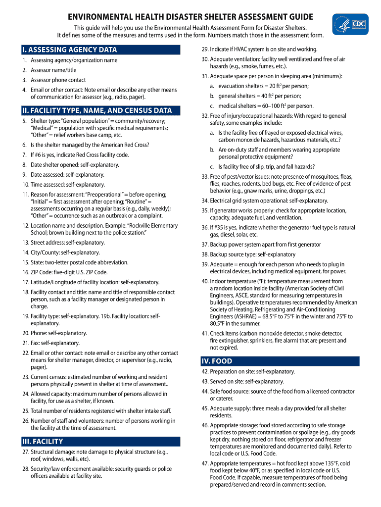 Get the free Environmental Health Assessment Form for Disaster Shelters ... - emergency cdc