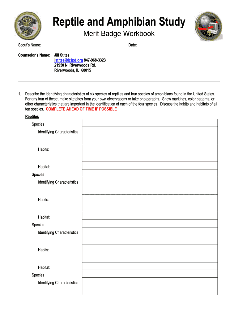Reptile and Amphibian Study Merit Badge Workbook Scouts Name: Date: Counselors Name: Jill States LCD.org 8479683323 21950 N. River woods Rd. River woods, IL 60015 1. Describe the identifying characteristics