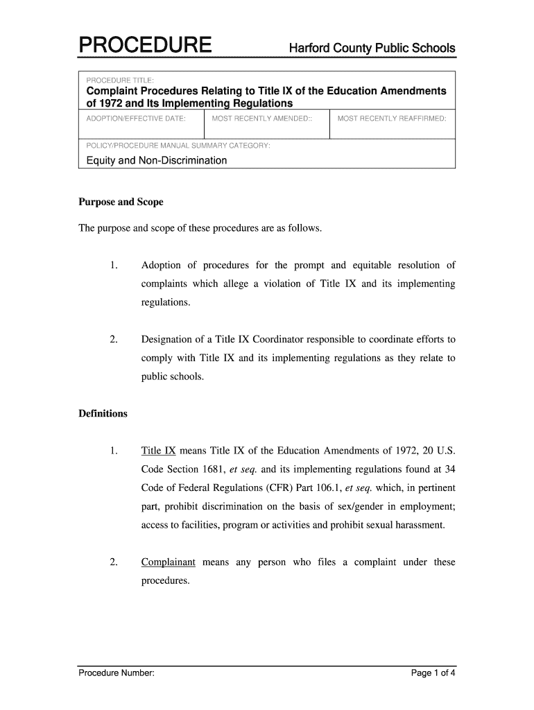 PROCEDUREHarford County Public SchoolsPROCEDURE TITLE:Complaint Procedures Relating to Title IX of the Education Amendments