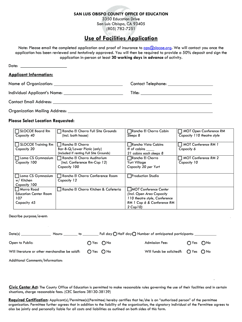 SAN LUIS OBISPO COUNTY OFFICE OF EDUCATION 3350 Education Drive San Luis Obispo, CA 93405 (805) 7827251Use of Facilities Application Note: Please email the completed application and proof of insurance
