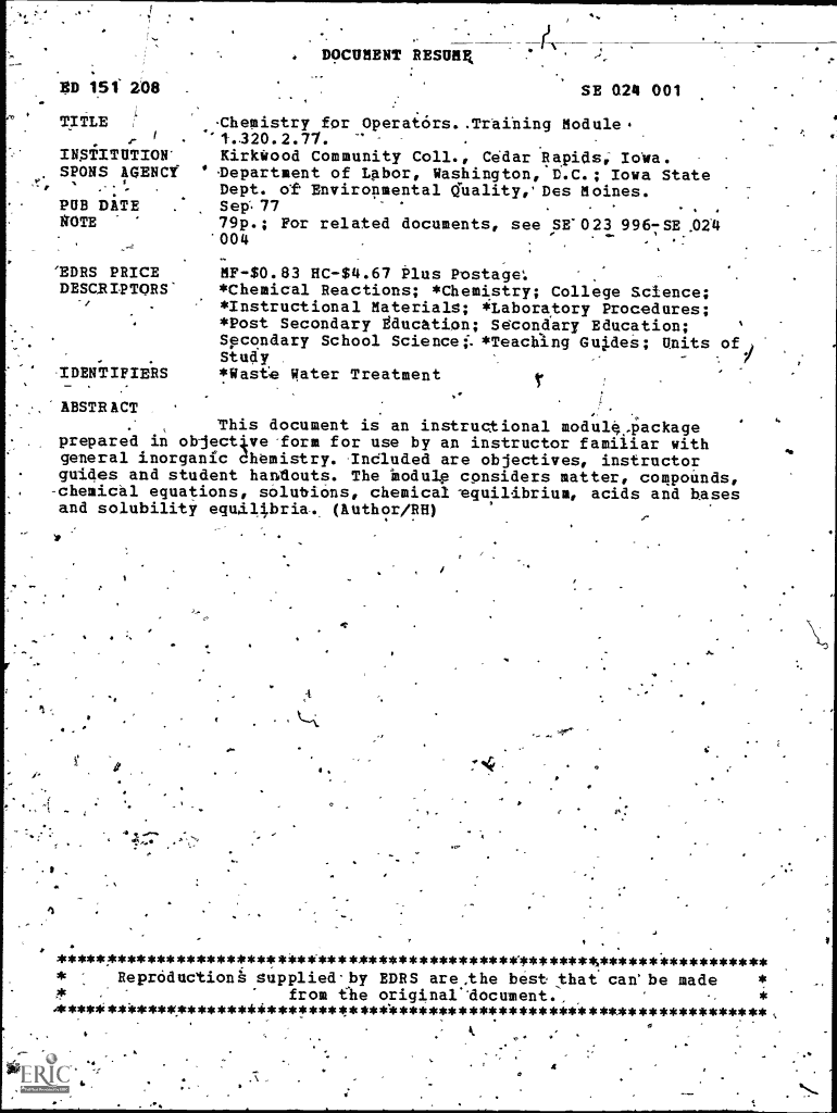 DOCUMENT RESULT ED 151 208 TITLES 024 001Chemistry for Operators. Training Module.IL.institution SONS AGENCY DATEKirkWood Community Coll., Cedar Rapids, Io4a. Department of Labor, Washington, D.C.