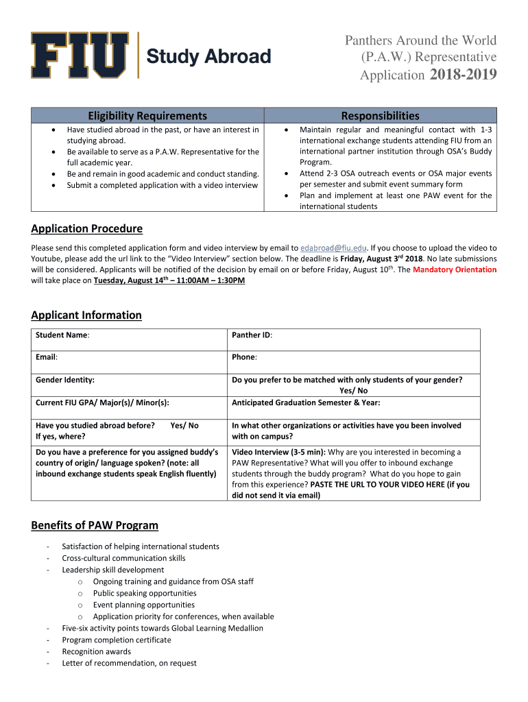 Panthers Around the World (P.A.W.) Representative Application 20182019 Eligibility Requirements ResponsibilitiesHave studied abroad in the past, or have an interest in studying abroad. Be available