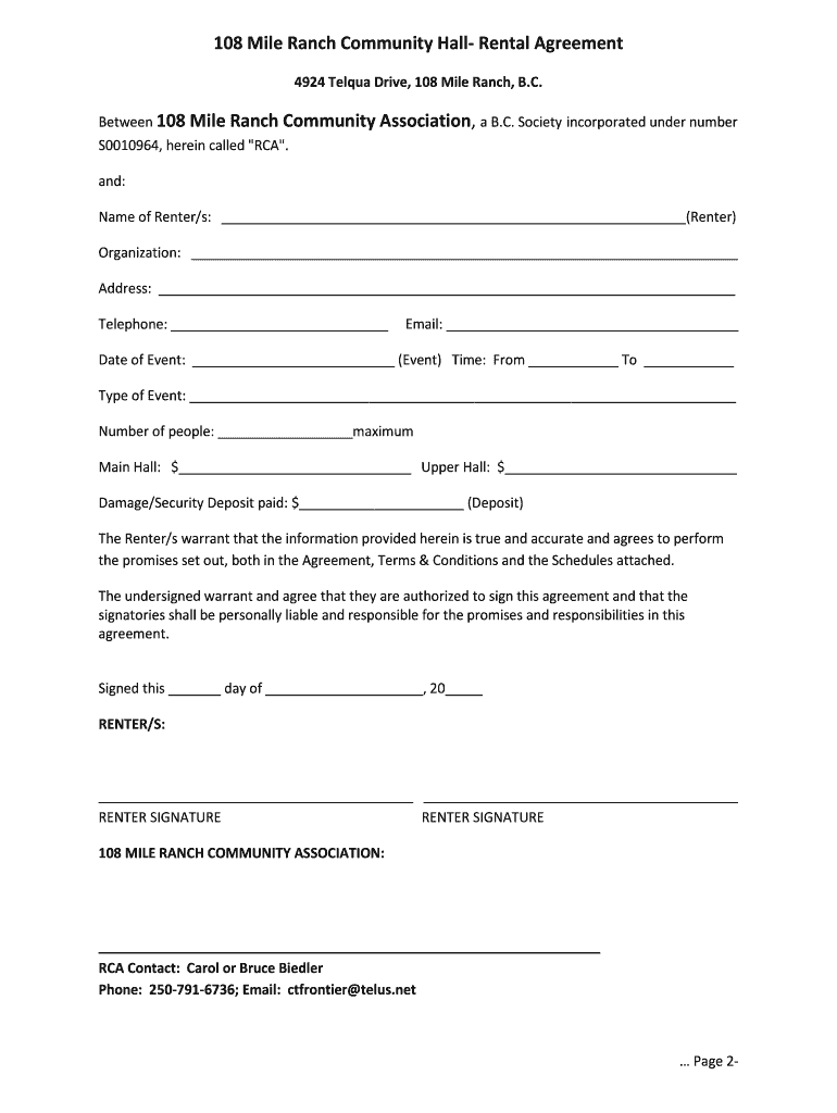 108 Mile Ranch Community Hall Rental Agreement 4924 Tel qua Drive, 108 Mile Ranch, B.C. Between 108 Mile Ranch Community Association, a B.C. Society incorporated under number S0010964, herein called