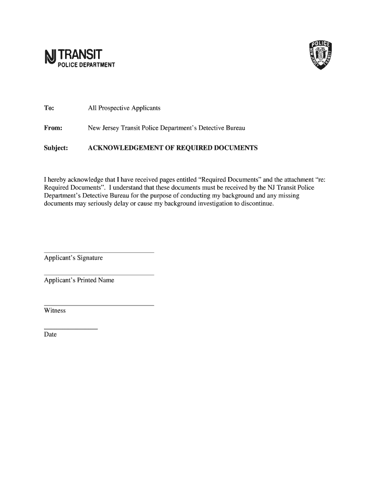 To:All Prospective ApplicantsFrom:New Jersey Transit Police Departments Detective BureauSubject:ACKNOWLEDGEMENT OF REQUIRED DOCUMENTS hereby acknowledge that I have received pages entitled Required