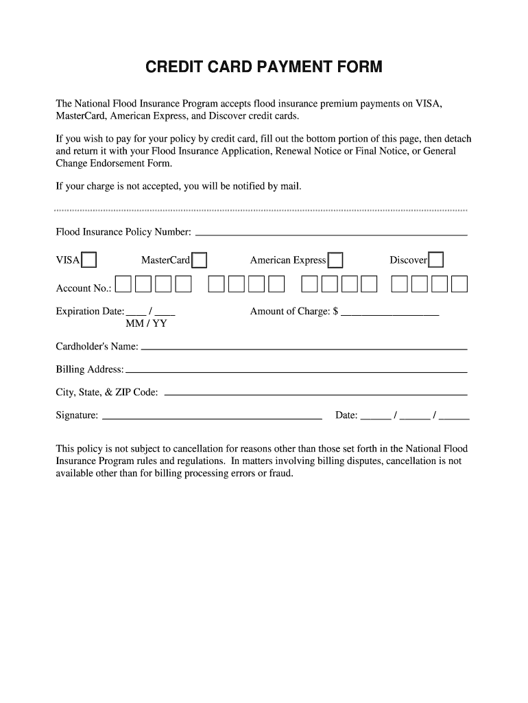 The Credit Card Payment Form is a business document used by individuals to make flood insurance premium payments via credit cards.
