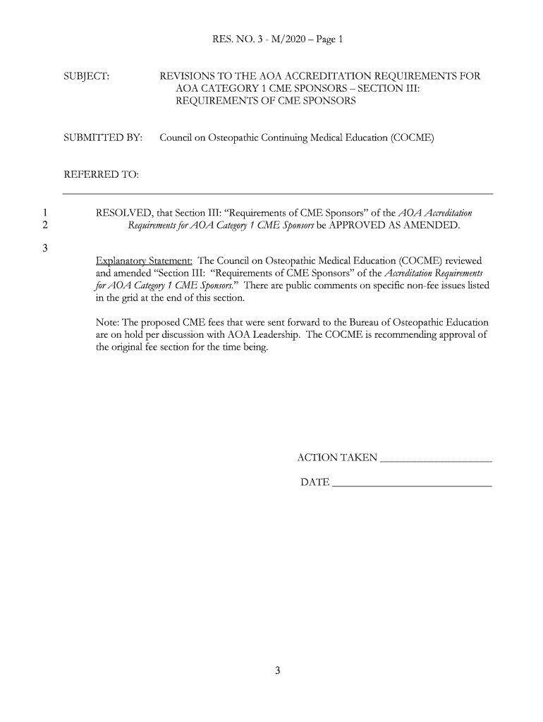 RES. NO. 3 M/2020-Page 1 SUBJECT:REVISIONS TO THE AOA ACCREDITATION REQUIREMENTS FOR AOA CATEGORY 1 CME SPONSORS SECTION III: REQUIREMENTS OF CME SPONSORSSUBMITTED BY:Council on Osteopathic Continuing